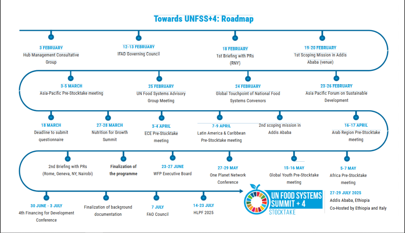 Other global events in 2025, such as the Nutrition for Growth Summit (March 2025, Paris), the Fourth Financing for Development Conference (June 2025, Seville), and the High-Level Political Forum on Sustainable Development (July 2025, New York) will play an integral role in setting the stage for UNFSS+4 outcomes. These events will provide opportunities to advance discussions on key issues, including financing for sustainable food systems, and will contribute to building momentum for the summit's objectives.